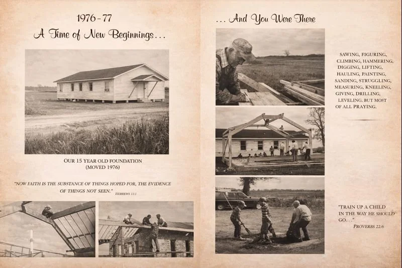 What began with church services in someone’s home grew to quickly become something far greater. In 1976, men and women gave their time, strength, and skills—sawing, hammering, lifting, measuring—but above all, praying. There was no spotlight, no fanfare—just faithful people answering a call and trusting God for what they could not yet see. That year, our humble church building was moved to Brule Guillot where the story begins for what is now.